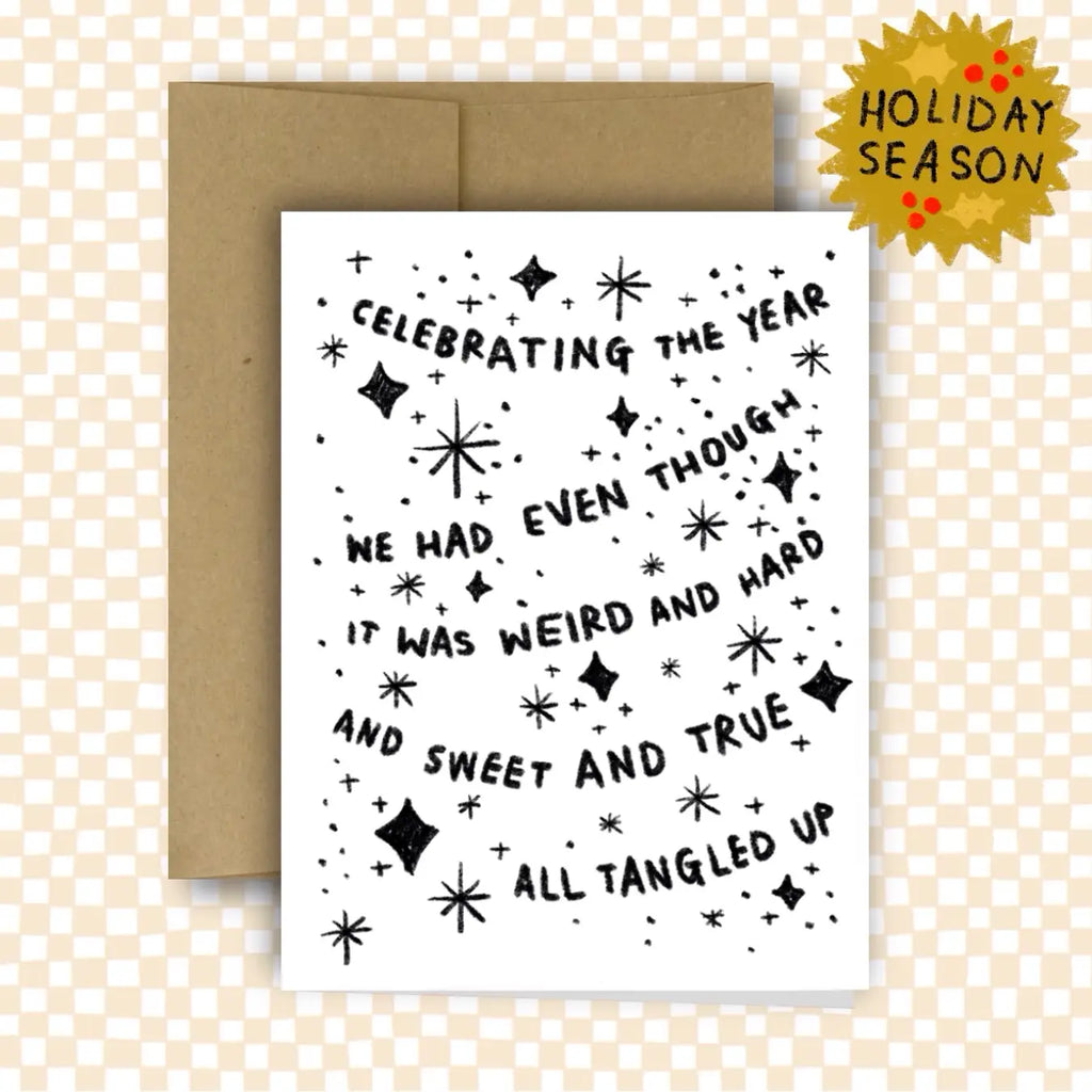 These charming Rani Ban Co cards come with a blank interior, perfect for your personal message. Crafted from gorgeous matte 100LB vellum, each white folded card measures 4 1/4” x 5 1/2” and arrives tucked inside a textured 30% recycled kraft envelope. Proudly printed in New York and made in the USA, every card is protected in a cello sleeve, ready to brighten someone’s day with your playful note.