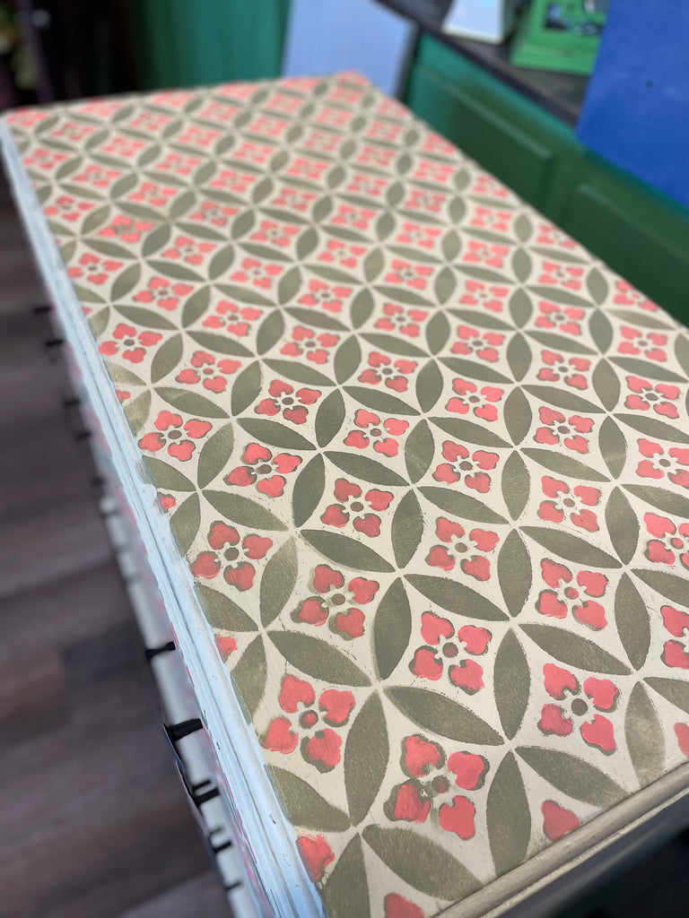 With a rich color and a durable finish, this antique dresser is a statement piece that will add both style and function to your home. This dresser is painted with Annie Sloan Versailles Chalk Paint while the drawer fronts and top of dresser have been stenciled using Annie Sloan Olive and Sandalwood Red Chalk Paint to make a statement. The dresser is sealed with Annie Sloan Clear Soft Wax for a long-lasting and beautiful addition to any room.