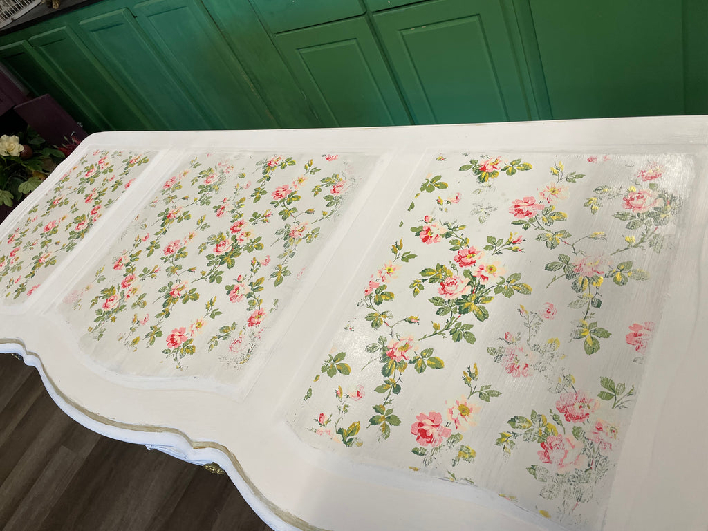 Add a touch of whimsy to your workspace with the Rococo White French Provincial Desk. Painted in soft Rococo White chalk paint and adorned with charming Rose Chintz inlay, this desk features a gently distressed finish that tells a story. The inlay, trim, and handles highlighted with Annie Sloan Modern Gold Metallic Paint. Sealed with a smooth white soft wax, it’s as durable as it is delightful—perfect for daydreaming and getting things done in style. The drawers are painted in the timeless Aubusson Blue – a subtle and sophisticated touch. Make a statement in your home with this chic and unique piece – oh là là!