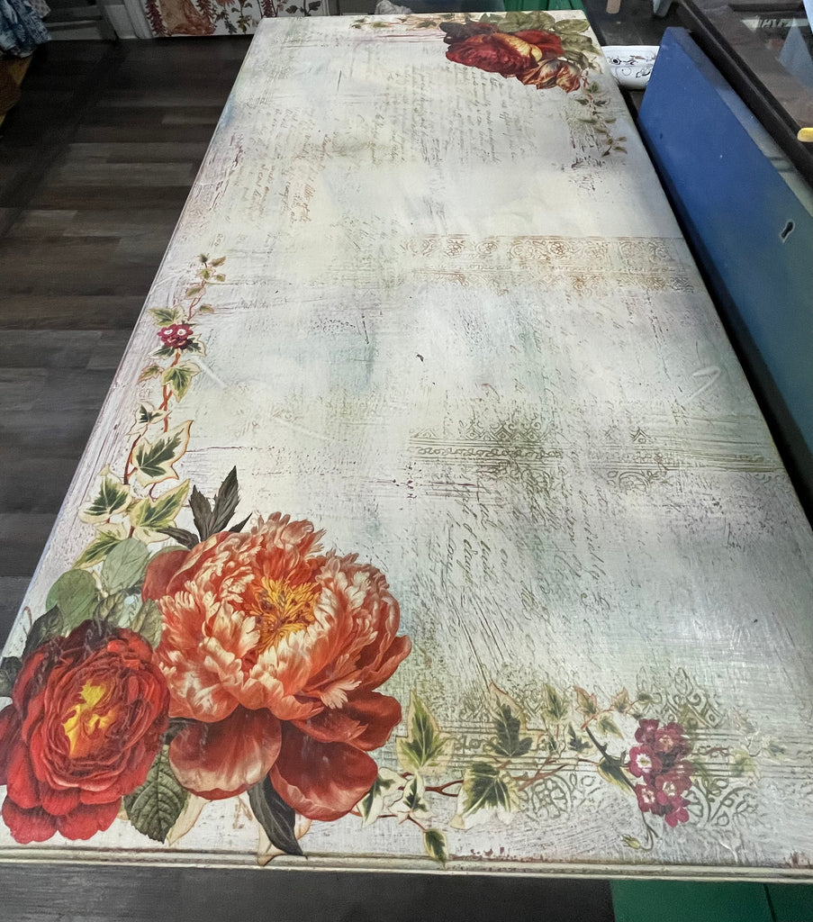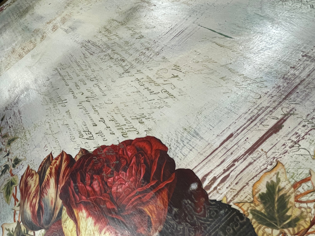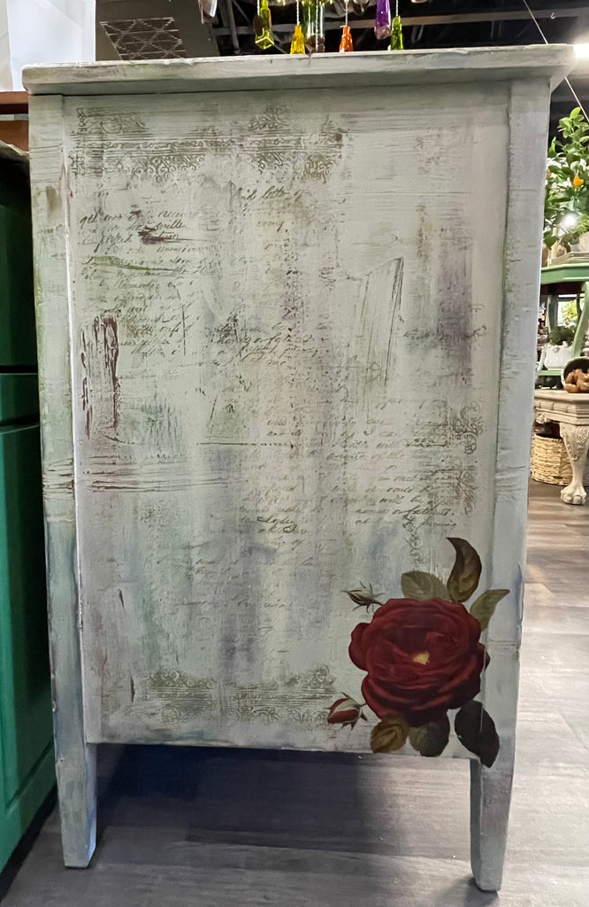 This charming two-drawer dresser is a masterpiece of layered artistry! Starting with a sophisticated Napoleonic Blue base, we built up dreamy washes of Firle, Capability Green, and Primer Red, then topped it all with creamy Original Chalk Paint. After a strategic sanding session, those gorgeous color layers peek through like hidden treasures. The magic continues with hand-applied Iron Orchid Designs transfers and stamps in rich olive and warm Honfleur tones, adding botanical charm and vintage character. Finished with a protective gloss lacquer, this one-of-a-kind piece is ready to anchor any room with personality and polish.